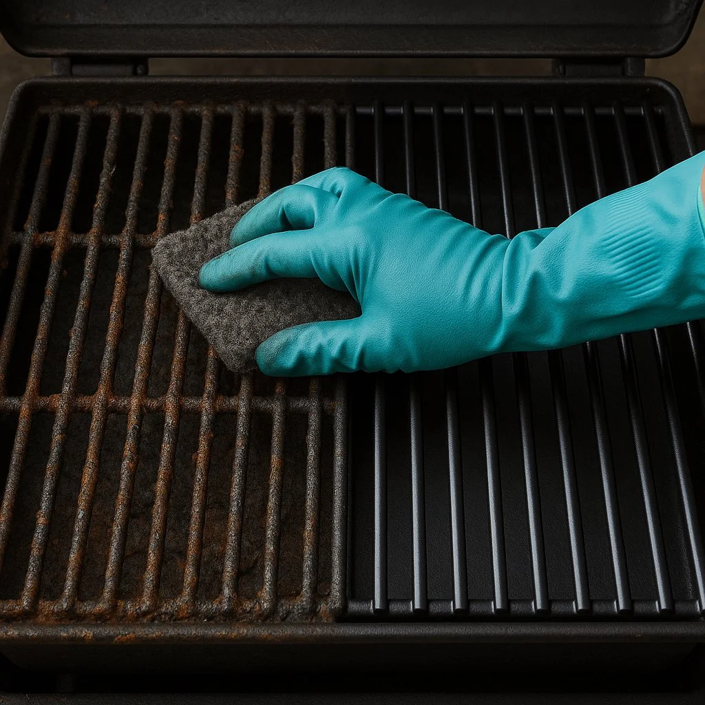 Mechanical and detailed hand degreasing and scrubbing off the burnt in debris and grease of firebox, burners, and hood interior